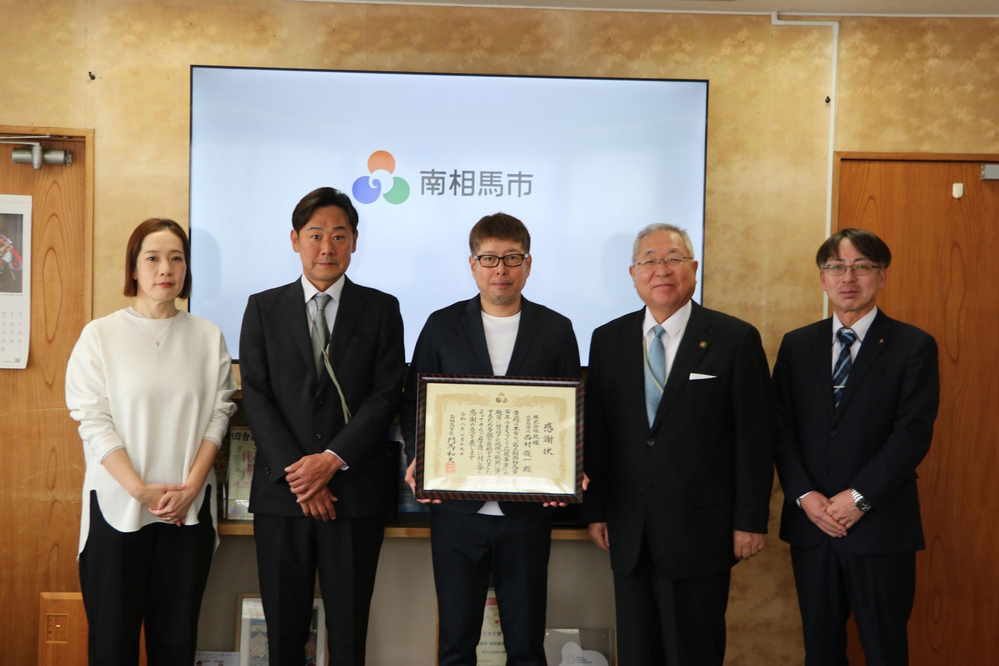 【令和8年4月16日】株式会社北雄様からのふるさと納税に係る感謝状贈呈式 更新日:2026年04月16日 ページID: 31055 株式会社北雄様から企業版ふるさと納税として寄附(50万円)をいただきました。 このことを受け、4月16日に市役所で、感謝状の贈呈式を執り行いました。 この記事に関するお問い合わせ先 総務部 秘書課 広報広聴係〒975-8686福島県南相馬市原町区本町二丁目27(本庁舎3階)直通電話:0244-24-5216ファクス:0244-23-7425お問い合わせメールフォーム