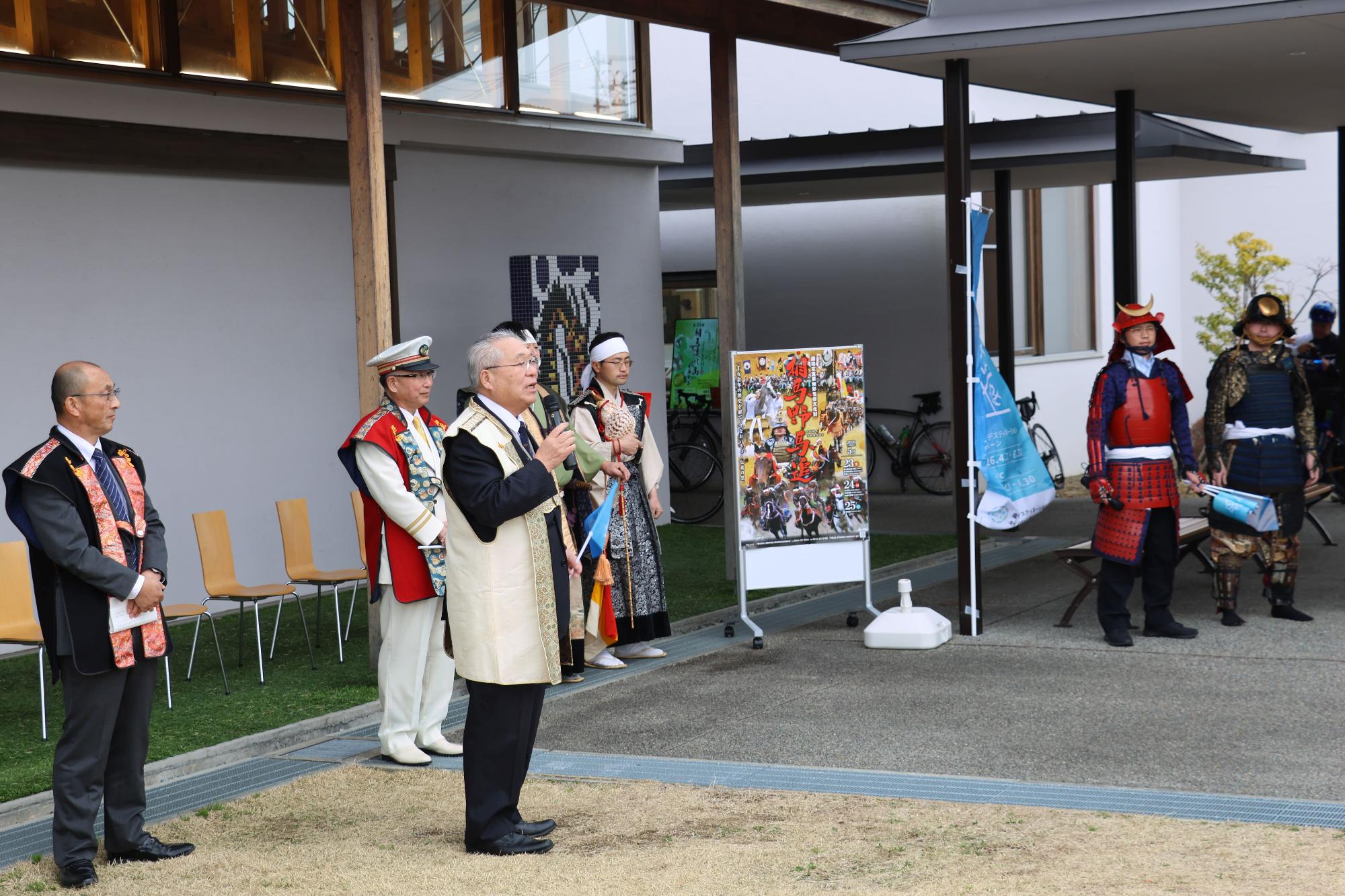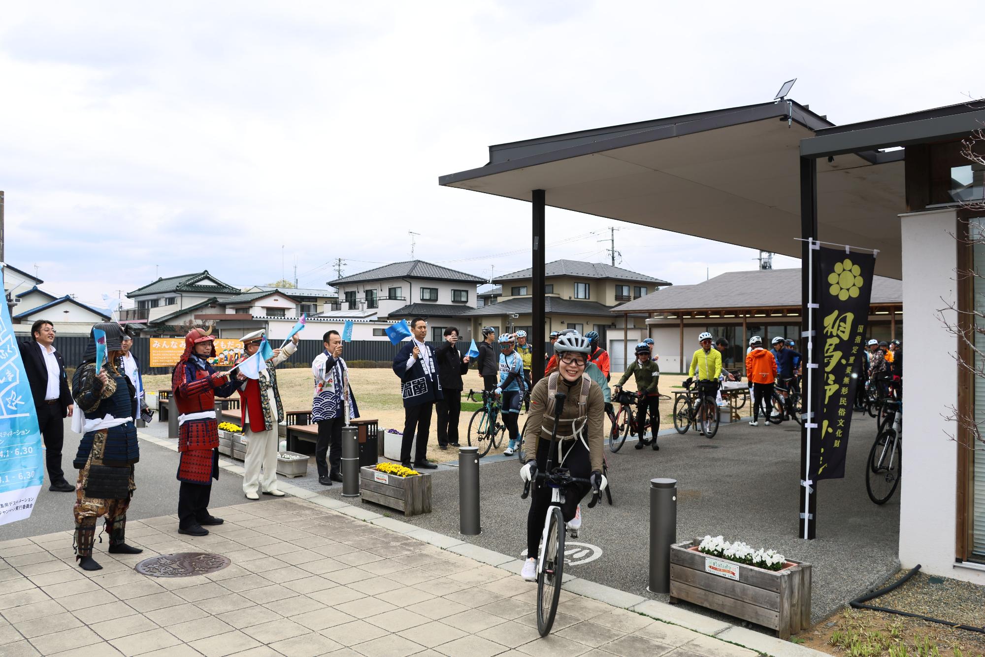 本市では小高交流センター内にエイドステーションが設けられ、特産品や飲食物がサイクリストたちに提供されるのとともに、歓迎セレモニーが開催されました。