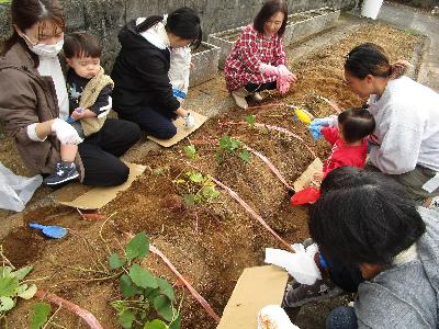 子育て支援センターでは、さつまいもの苗植え体験を開催しました。