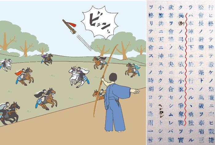 昭和20年の野馬追のイメージ図。騎馬武者の方へ小旗を弓矢で打ち上げているイラスト。