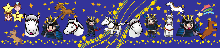 馬、甲冑姿の男の子、星、天の川などが並ぶ帯状の画像