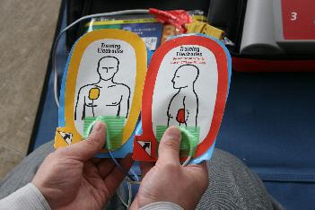 傷病者の衣服を脱がせ、胸部を裸にします。パッドの粘着面を傷病者の胸にしっかりと貼ります。