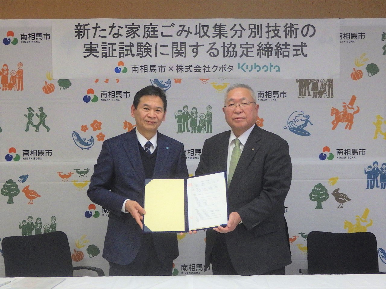南相馬市では、家庭から排出される生ごみや紙ごみ等のバイオマス資源について、従来の収集方法と比較し、より効率的かつ高い精度で収集・分別する技術の有効性を検証するため、令和8年2月18日に株式会社クボタと「新たな家庭ごみ収集分別技術の実証試験に関する協定」を締結しました。