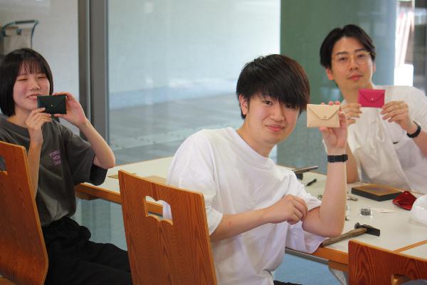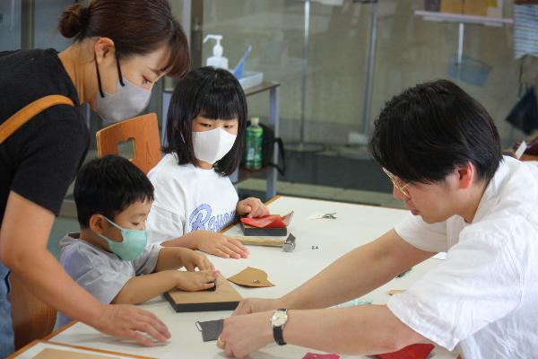 ワークショップに参加した人々は、やり方を教わりながら、革の小物作成に取り組みました。