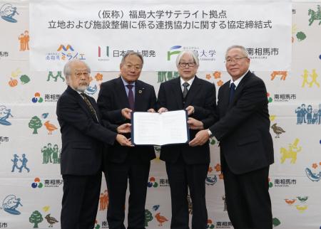 令和8年3月11日に、国立大学法人福島大学と日本国土開発株式会社、一般社団法人南相馬ミライエ、南相馬市は、南相馬市小高区に「(仮称)福島大学サテライト拠点」を設置することを目的として、連携協力協定を締結しました