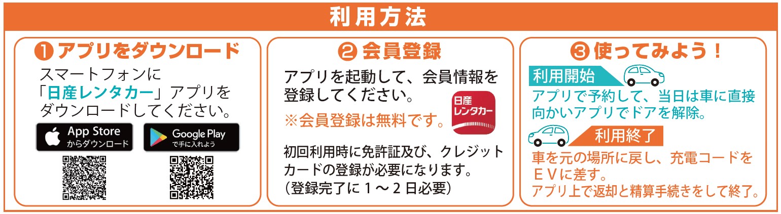 専用のアプリをスマートフォンでダウンロードし、必要事項を事前登録しておけば、予約、車の施錠と解除、返却、支払までをスマートフォンひとつで完結でき、深夜等(休日のみ)のご利用・ご返却も可能ですので、休日の移動手段としてぜひご利用ください。