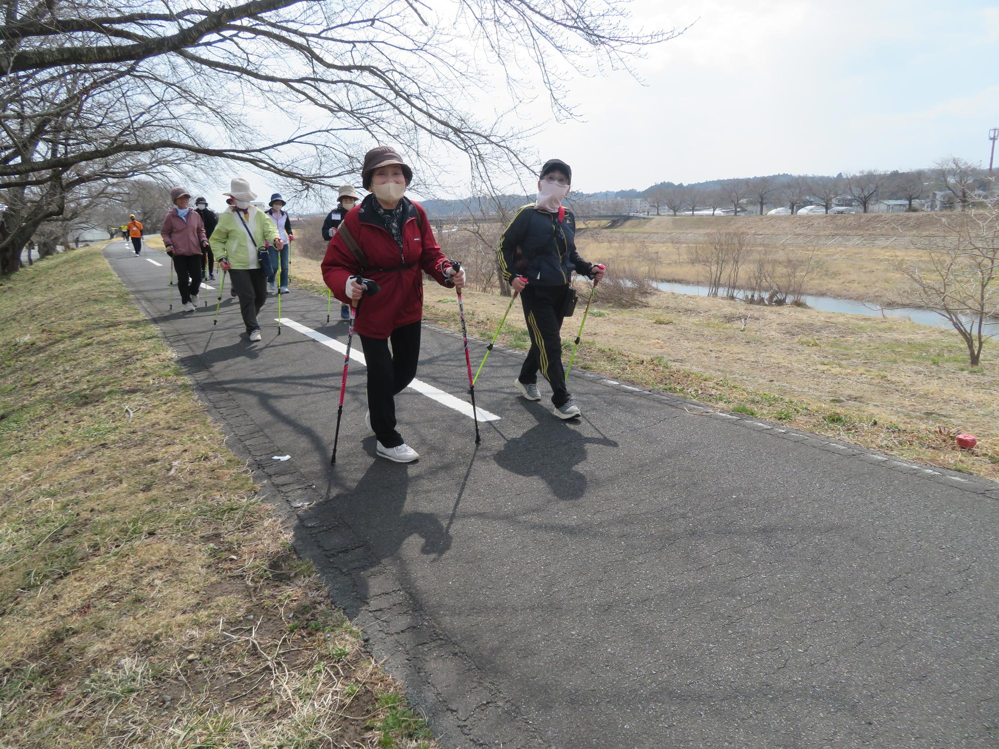専用ポールを持って歩き、上半身が活動することで、エネルギー消費量が上昇するウオーキングです。鹿島の春を感じながら気持ちよく歩きましょう