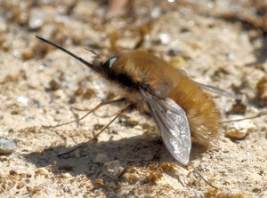 昆虫にも同じ呼び名をもつものがあります。そのひとつが「アブ」の仲間の「ビロードツリアブ」。アブといっても花の蜜を吸って生活する無害な昆虫で、そのうえ、全身がモフモフの毛で覆われた愛らしい姿をしています。博物館のある東ヶ丘公園の周りでも普通に見ることができます。